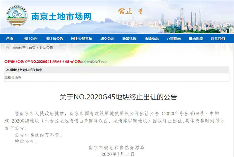 早在6月12日,南京掛出10幅涉宅地塊,要求按照“限房?jī)r(jià)、競(jìng)地價(jià)”的方式出讓。7月14日,南京市規(guī)劃和自然資源局發(fā)布公告稱,經(jīng)南京市人民政府批準(zhǔn),南京市國(guó)有建設(shè)用地使用權(quán)公開(kāi)出讓公告(2020年寧出第08號(hào))中的NO.2020G45地塊(六合區(qū)龍池街道白果南路以西、龍灣路以南地塊)因故終止出讓,具體交易時(shí)間另行發(fā)布公告。