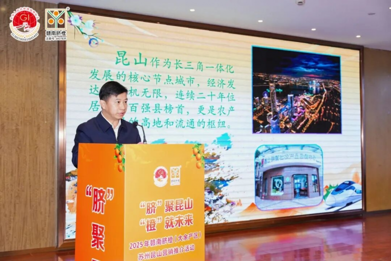 中共大余縣委副書記彭鋼上臺致辭,從大余的生態(tài)稟賦、產(chǎn)業(yè)基礎(chǔ)與文旅資源出發(fā),向與會嘉賓全面推介了大余贛南臍橙產(chǎn)業(yè)的發(fā)展?jié)摿εc合作機遇,表達了攜手昆山拓展長三角市場的誠摯愿景。