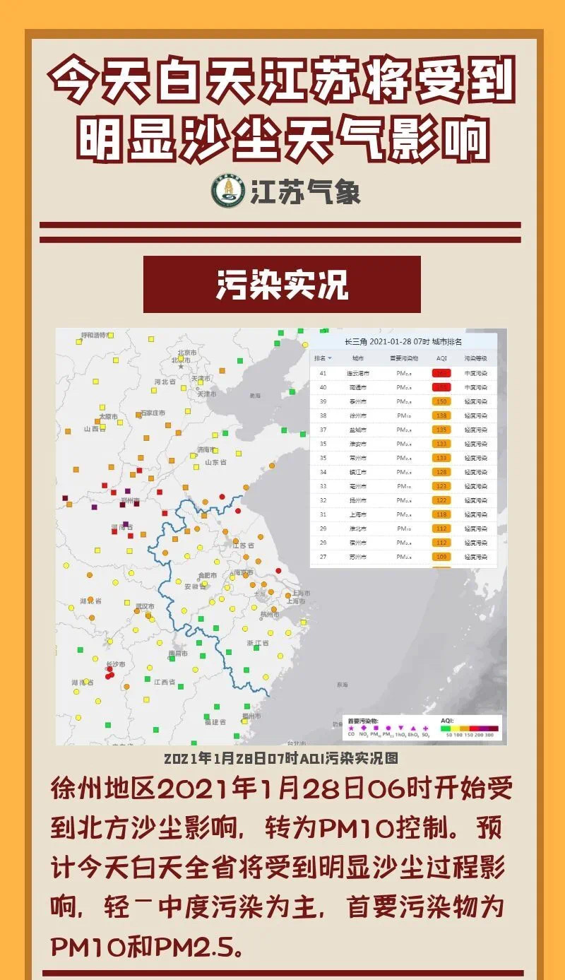 隨著較強(qiáng)冷空氣來到江蘇,全省偏北風(fēng)風(fēng)力加大。南京全市普遍出現(xiàn)5到6級偏北大風(fēng)。讓人在享受陽光的同時,感受到風(fēng)中凌亂的滋味。徐州地區(qū)2021年1月28日6時開始受到北方沙塵影響,白天全省將受到明顯沙塵過程影響,輕一中度污染為主,首要污染物為PM10和PM2.5。