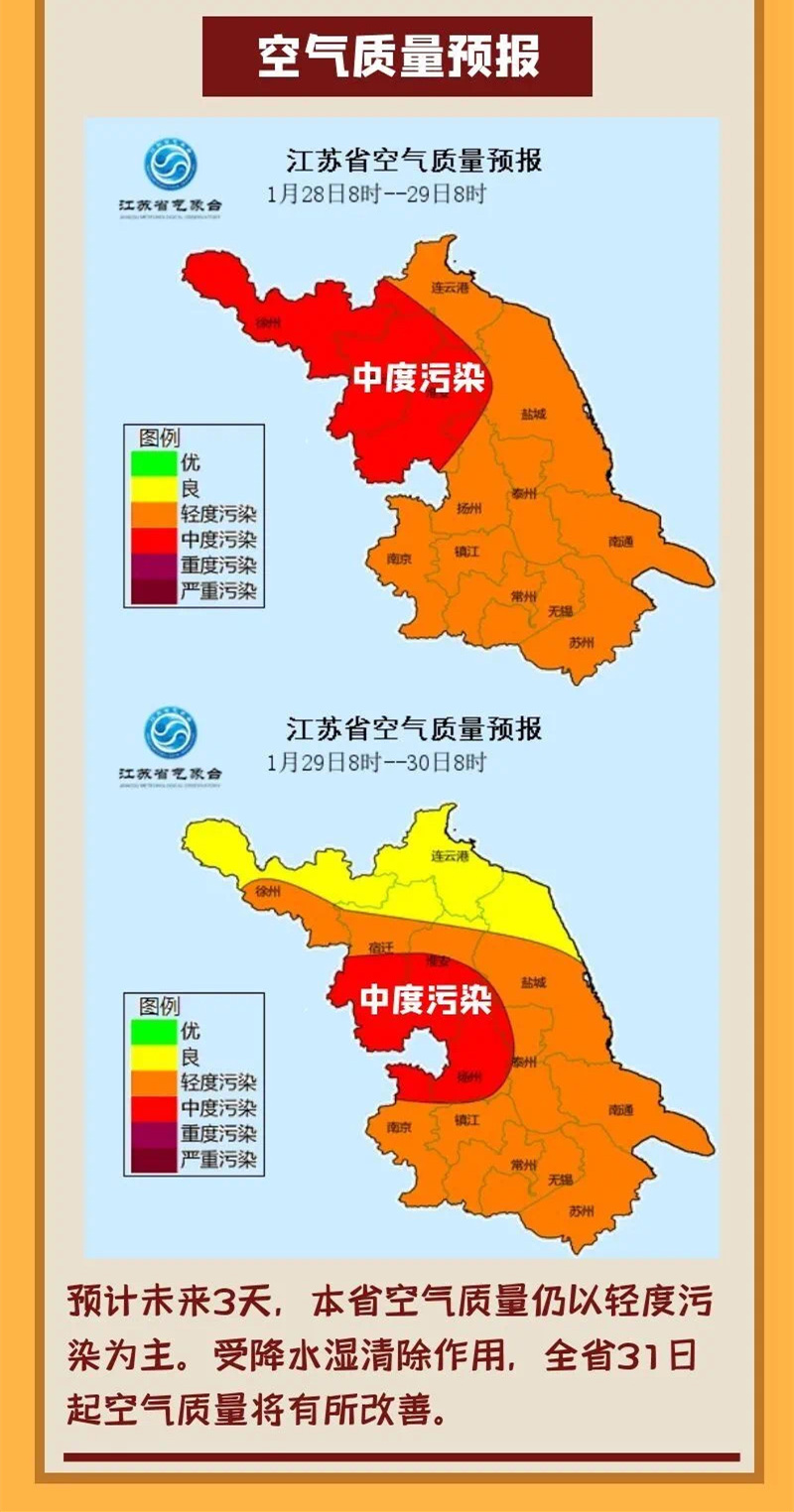 江蘇氣象解釋說,受較強(qiáng)冷空氣影響,強(qiáng)冷空氣從沙源地裹挾沙塵顆粒迅速南下影響下本省,全省空氣污染氣象條件較差。預(yù)計未來3天,空氣質(zhì)量仍以輕度污染為主。1月31日淮河以南地區(qū)陰有小到中雨,受降水濕清除作用,31日起空氣質(zhì)量將有所改善。