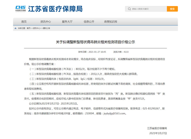 降價(jià)!江蘇擬調(diào)整新型冠狀病毒肺炎相關(guān)檢測(cè)項(xiàng)目?jī)r(jià)格