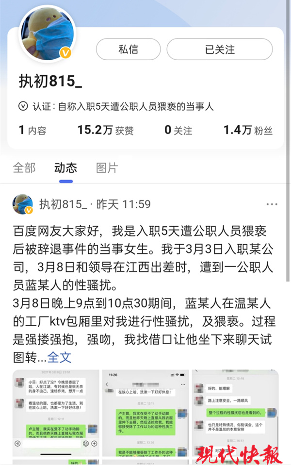 現(xiàn)代快報(bào)記者發(fā)現(xiàn),該網(wǎng)帖發(fā)布于3月15日,@執(zhí)初815_ 在網(wǎng)帖中稱,自己于3月3日入職廣州某公司,3月8日和領(lǐng)導(dǎo)在江西出差,期間在一家KTV包廂中遭到當(dāng)?shù)厮痉ň忠凰{(lán)姓副局長的強(qiáng)吻、摟抱,觸摸隱私部位等騷擾。