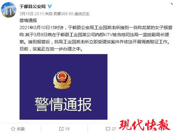記者注意到,3月15日23點(diǎn)11分,江西于都縣公安局通過其官方微博發(fā)布了“警情通報(bào)”:“2021年3月10日15時(shí)許,于都縣公安局工業(yè)園派出所接到一自稱龍某的女子報(bào)警稱:其于3月8日晚在于都縣工業(yè)園某公司內(nèi)部KTV被當(dāng)?shù)厮痉ň忠凰{(lán)姓副局長猥褻。接到報(bào)警后,我局工業(yè)園派出所立即受理該案件并依法開展調(diào)查取證工作。目前,該案正在進(jìn)一步辦理之中。”
