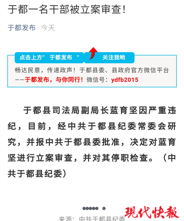 3月16日上午,記者致電江西省于都縣紀(jì)委。一名工作人員表示,紀(jì)委已經(jīng)介入調(diào)查此事,后續(xù)若有調(diào)查結(jié)果會(huì)對外公布。于都縣紀(jì)委也在當(dāng)天中午發(fā)布消息:“于都縣司法局副局長藍(lán)育堅(jiān)因嚴(yán)重違紀(jì),目前,經(jīng)中共于都縣紀(jì)委常委會(huì)研究,并報(bào)中共于都縣委批準(zhǔn),決定對藍(lán)育堅(jiān)進(jìn)行立案審查,并對其停職檢查。”
