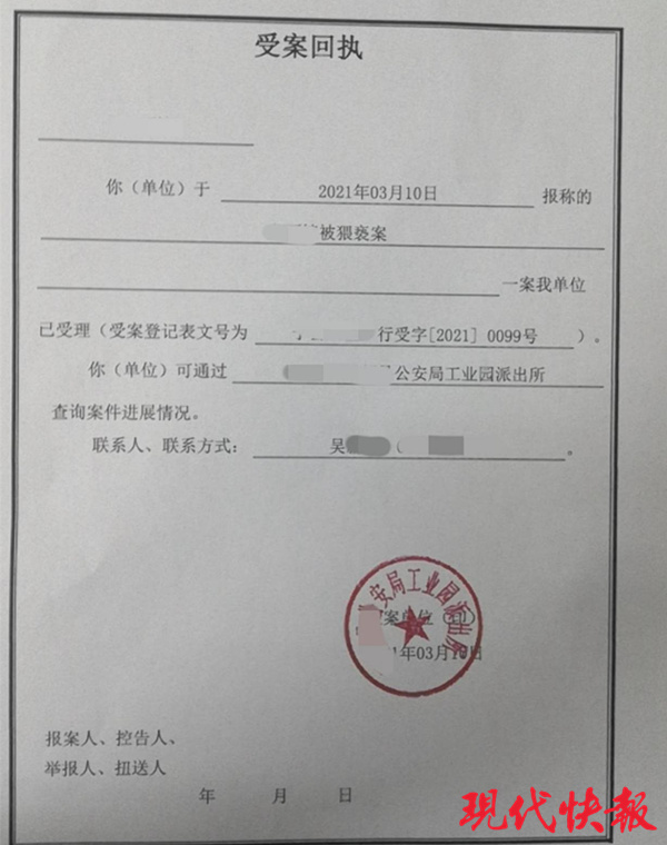 @執(zhí)初815_ 表示,她已在江西、廣東兩地報(bào)警,希望為自己的遭遇討個(gè)說法?,F(xiàn)代快報(bào)記者注意到,@執(zhí)初815_ 在網(wǎng)帖中展示了自己報(bào)警后獲取的受案回執(zhí),該回執(zhí)單落款為某地公安局工業(yè)園區(qū)派出所,報(bào)警時(shí)間為3月10日,原因?yàn)?ldquo;猥褻案”。
