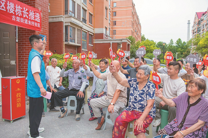 6月18日,宿遷經(jīng)濟(jì)技術(shù)開發(fā)區(qū)古楚街道朱圩社區(qū)古楚公寓小區(qū)開展“民主議事會”,居民當(dāng)“考官”,現(xiàn)場票選樓棟長。徐江海 攝 (視覺江蘇網(wǎng)供圖)