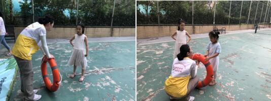 隨后,陳老師又給大家?guī)砹艘患蠖Y--“救生圈”,小朋友紛紛伸出手感受它表面的紋理以及它的重量。陳老師告訴小朋友們,救生圈雖然是一個有利的工具,但是在遇到他人呼救時不能率性而為,要充分考慮自己的能力,及時需求大人幫助。