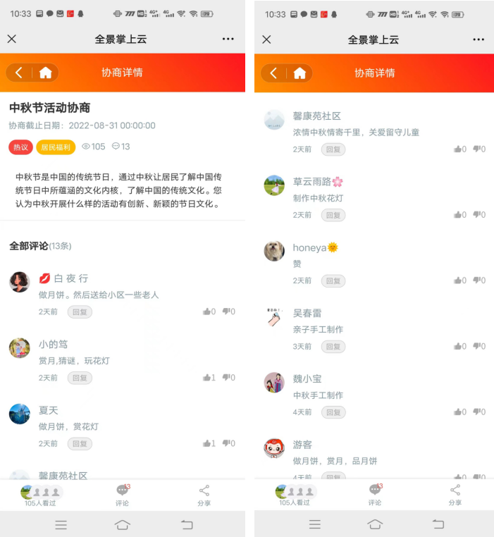 “喜迎中秋,共建鄰里情。共制月餅、共品月餅活動很歡樂”、“可開展一些親子互動,讓這個中秋更有意義”、“獨居空巢老人不容忽視,支持社區(qū)中秋節(jié)能為他們送溫暖”、“為了讓大家過上一個清清爽爽的節(jié)日,可進行一次環(huán)境整治,發(fā)動黨員和居民志愿者參與”、“期待廣場趣味活動”、“中秋健康義診也挺不錯”、“也可開展一些經(jīng)典誦讀、節(jié)日聯(lián)歡等活動”......線上,居民們紛紛留言表達了對中秋活動策劃的想法。