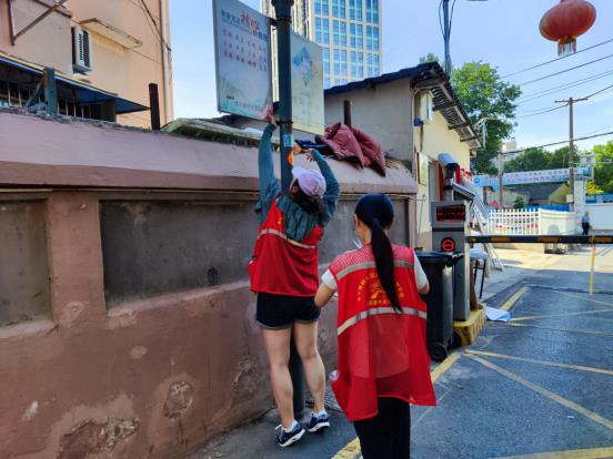 “快看,我找到一處公益廣告卷邊,把膠帶給我,重新固定一下更美觀。”青年志愿者何歆鈺發(fā)現(xiàn)金寧新村小區(qū)2號門入口處燈桿上的道旗卷邊,現(xiàn)場進行整改?;顒又?,青年志愿者們還對公益廣告宣傳欄進行擦拭清潔,同時,對過往居民進行文明宣傳,增強他們愛護轄區(qū)公共設施的意識,確保轄區(qū)文明創(chuàng)建宣傳陣地良好形象,讓居民在潛移默化中接受文明的洗禮。