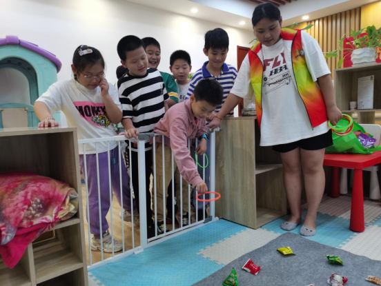 活動(dòng)開(kāi)始前,社區(qū)工作人員向小朋友們宣傳《未成年人保護(hù)法》,呼吁小朋友們要遠(yuǎn)離校園暴力,對(duì)待同學(xué)和諧友愛(ài)?;顒?dòng)開(kāi)始后,簡(jiǎn)單的套圈游戲拉開(kāi)了本次活動(dòng)的序幕,社區(qū)工作人員組織小朋友們站在線外一個(gè)接一個(gè)的排好隊(duì),努力套中自己想要的獎(jiǎng)品。