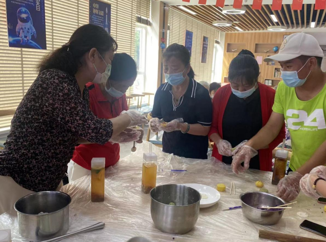 不一會兒,活動現(xiàn)場坐滿了前來參加活動的老年居民,社區(qū)工作人員向大家演示、介紹制作月餅的技巧和過程,居民分工合作,和面、稱重、壓皮、包餡、按壓,將其放進各種花紋的模具之中定型,每個步驟有條不紊。制作過程中,大家還左右交談拉起家常,“我還沒有做過月餅?zāi)?這次終于有機會試試了”“我要把做好的月餅帶給家人品嘗,他們一定會很開心”……在嘰嘰喳喳的講話聲中月餅制作完成,居民們把月餅裝進精美的袋子中,幸福歡樂洋溢在每位居民的臉上.