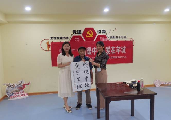 活動中,“芊云匯”的叔叔阿姨們通過民族舞、太極、民族樂器以及黃梅戲傳遞著節(jié)日的喜悅,居家養(yǎng)老中心的老年人們一邊吃著零食,一邊觀看著節(jié)目,開心不已,一個節(jié)目表演完,大家都吆喝著再來一個。表演之余,還設(shè)置了猜燈謎環(huán)節(jié),老人們你一言我一語,爭前恐后地互相猜測,猜不出題時(shí)臉上露出疑難之情,猜出答案后高興不已,還可以獲得小禮品一份,整個活動現(xiàn)場洋溢著和諧、喜慶的節(jié)日氛圍?;顒幼詈?,一位書法愛好者更是現(xiàn)場書寫了今日的活動主題,并送給了社區(qū)。