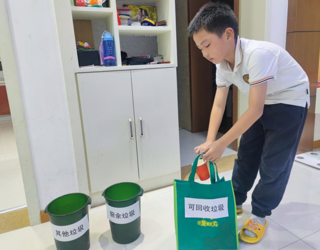 線上學(xué)習(xí)之后,家長們在家設(shè)置“兩桶一袋”,現(xiàn)場教育孩子分類收集垃圾。“兩桶”即廚余垃圾桶、其他垃圾桶;“一袋”是指類似紙張、塑料瓶、易拉罐等可回收物,可單獨裝在一個袋子里。孩子們紛紛表示,書籍中的內(nèi)容加上自己動手實踐,使自己意識到垃圾分類要從自身做起,從一個個綠色環(huán)保的小家庭延伸到社會大家庭。