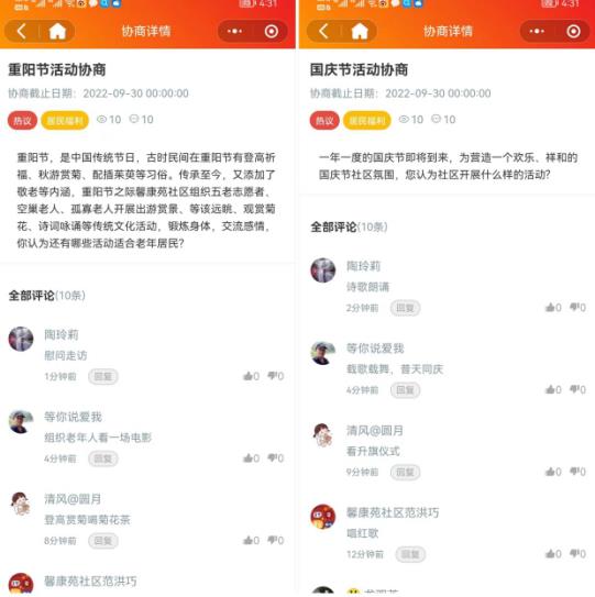 “國慶節(jié)社區(qū)可以組織觀看天安門升國旗直播”,“社區(qū)可以組織居民朋友參觀愛國基地,開展愛國教育宣傳”,“社區(qū)可以組織居民開展唱紅歌比賽”,“社區(qū)可以開展我為祖國慶生攝影比賽”,“社區(qū)可以組織居民登高,賞菊,吃重陽糕等”,居民朋友們在“掌上云”線上協(xié)商版塊積極發(fā)表自己的建議,希望通過自己的建議參與到為祖國慶生活動和重陽節(jié)活動中去。
