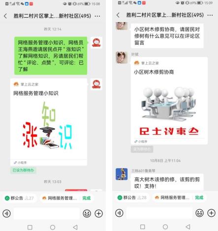 社區(qū)充分發(fā)揮網絡線上平臺的宣傳引導作用,在電子顯示屏、網格員在網格居民微信群持續(xù)推送政府部門相關惠民政策及法律法規(guī)等知識,提高廣大居民群眾對社會化管理的知曉率及參與度。居民也可以通過微信群隨時反映其建議與想法,使社區(qū)治理更深入人心。