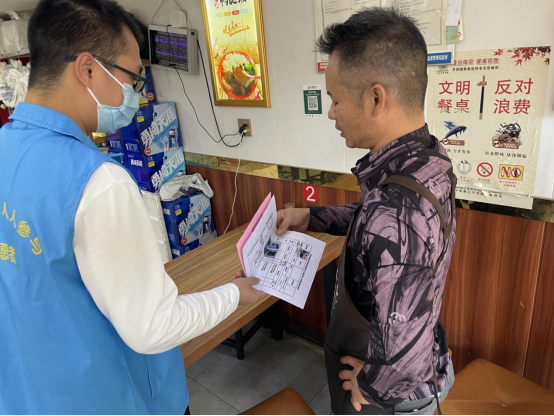 行動中,志愿者們來到花港路沿街門面房,逐戶走入每家商戶,檢查防疫、油煙凈化器清洗情況,提醒商戶佩戴口罩。對防疫措施不完善的商戶要求現(xiàn)場整改,并提醒商戶及時清洗油煙凈化器并保存好相關(guān)票據(jù),督促沒有辦理污水排放許可證的商戶及時辦理,對沒有領(lǐng)取門前三包責(zé)任書的商戶提醒其來社區(qū)領(lǐng)取。