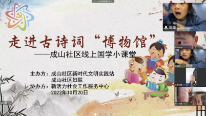腹有詩(shī)書氣自華,最是詩(shī)書能致遠(yuǎn)。古詩(shī)詞是我國(guó)古典文化的精髓,為推動(dòng)博大厚重的漢文化“活起來”,弘揚(yáng)文化提高素養(yǎng),10月20日晚,江寧區(qū)淳化街道成山社區(qū)新時(shí)代文明實(shí)踐站聯(lián)合南京市江寧區(qū)新活力社會(huì)工作服務(wù)中心開展線上國(guó)學(xué)小課堂:走進(jìn)古詩(shī)詞“博物館”,以詩(shī)詞浸潤(rùn)其心,以詩(shī)歌陶冶其行,帶領(lǐng)孩子們從詩(shī)詞中領(lǐng)悟國(guó)學(xué)魅力。