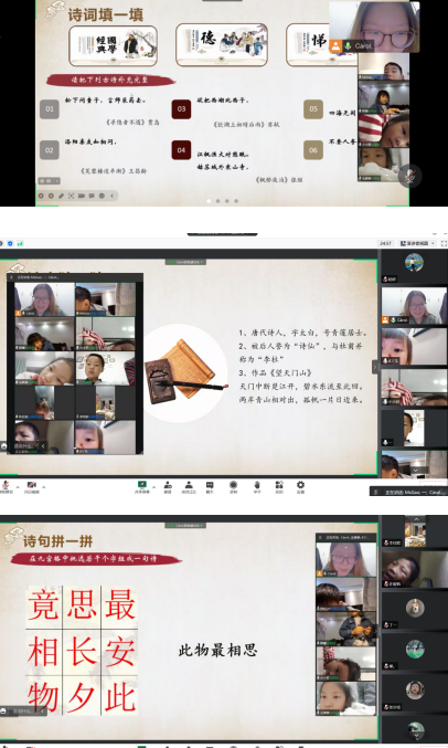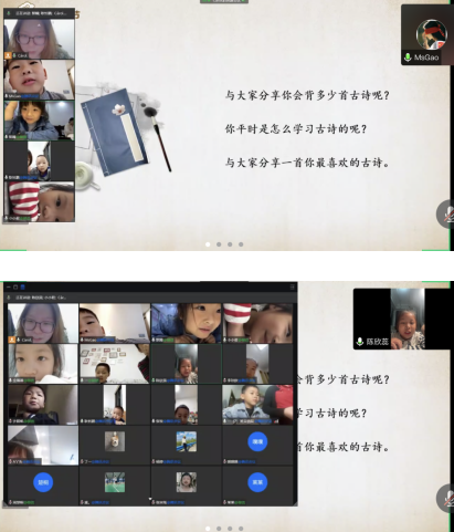 “我從小就背誦《唐詩(shī)三百首》。”“在學(xué)校有老師教,在家里爸爸媽媽會(huì)抽背。”社工首先開啟了“古詩(shī)詞大調(diào)查”環(huán)節(jié),孩子們依次分享自己大約會(huì)多少首古詩(shī)詞,平時(shí)如何學(xué)習(xí)古詩(shī)詞,并背誦出自己最拿手最喜歡的一首古詩(shī)詞,大家爭(zhēng)先恐后地展現(xiàn)自己的本事,線上活動(dòng)的氛圍瞬間被帶動(dòng)了起來。