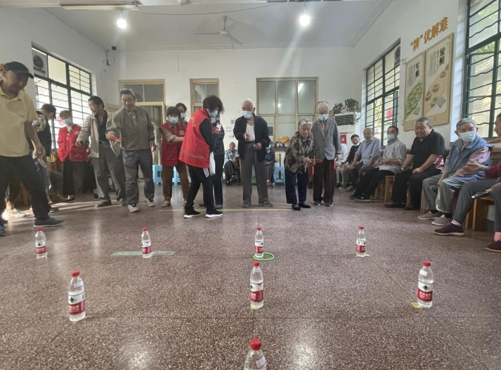 志愿者們還組織了一場(chǎng)套圈活動(dòng),在地上擺放礦泉水瓶,瓶身貼上寫有不同字樣的紙條,引導(dǎo)老年殘疾人們站在線外,大展身手,根據(jù)套中的紙條字樣,送上豐富多樣的小禮品。
