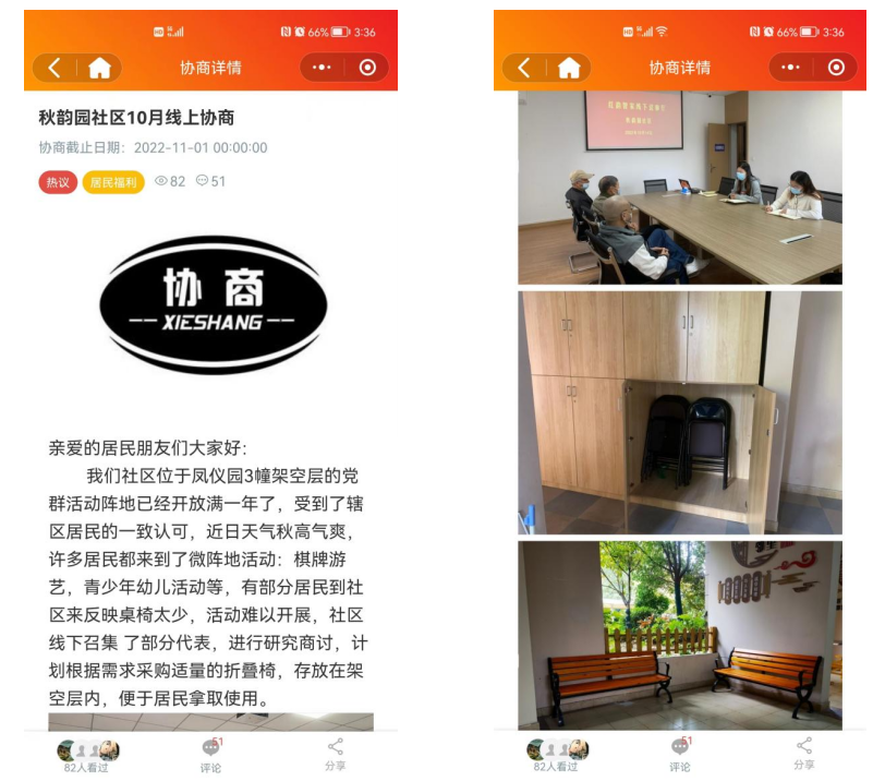 秋韻園社區(qū)“紅韻”黨群服務微陣地自開放以來,受到了轄區(qū)居民的一致認可,近日天氣秋高氣爽,許多居民都來到了微陣地進行棋牌游藝、青少年手工等活動,有部分居民反映活動陣地桌椅太少,活動難以展開,社區(qū)“紅韻小管家”在掌上云“線上協商”模塊發(fā)布議事,針對架空層桌椅的樣式和數量進行討論,同時在線下召集了部分居民代表,進行同步研究商討,社區(qū)根據線上線下共同協商的情況,最終確定了微陣地的桌椅采購款式和數量。