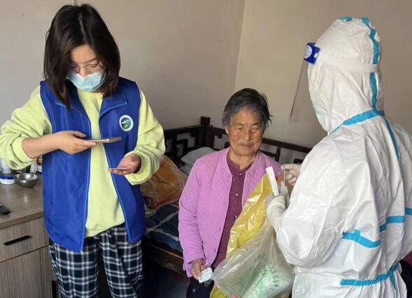 村001網(wǎng)格員端木和麗,負(fù)責(zé)帶領(lǐng)谷里衛(wèi)生院支援醫(yī)生給老弱病殘上門逐戶做核酸。