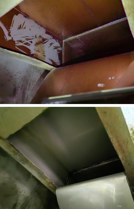 本次整治消防隱患行動(dòng)后,煙道恢復(fù)了原本的內(nèi)壁鐵皮色,不留有塊狀頑固的油漬,灶臺(tái)的表面無(wú)油污且光亮整潔,風(fēng)機(jī)葉輪的表面可以看見(jiàn)底漆,電機(jī)底部沒(méi)有沉淀的油漬,管道外部沒(méi)有油漬和頑固的油垢。