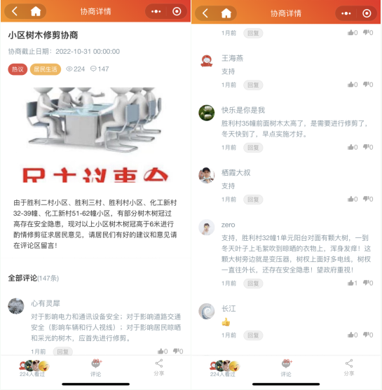 “勝利村前面的樹木太高了,是需要進行修剪了,冬天快到了,早點實施才好。”由于小區(qū)內(nèi)部分樹木長得過高,不僅影響居民采光,還存在著安全隱患??紤]居民生活實際,近日,南京市棲霞區(qū)燕子磯街道電瓷社區(qū)通過“掌上云社區(qū)”開展線上民主議事會,就修剪樹木一事向居民廣泛征集意見和建議。