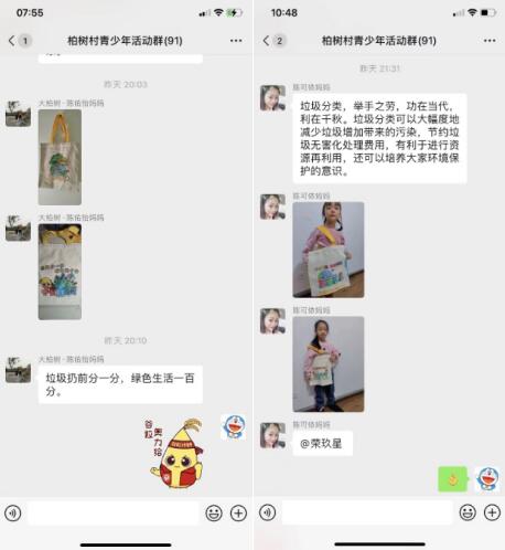 活動(dòng)開始,工作人員在群里向大家深入講解了垃圾對(duì)地球的危害、垃圾分類的必要性以及在日常生活中如何做好垃圾分類,并通過問答互動(dòng)的方式舉例生活中常見的垃圾是屬于哪類垃圾。青少年在群里及時(shí)回復(fù),積極互動(dòng),提升線上活動(dòng)氛圍。在家長們的指導(dǎo)下,青少年還手繪了垃圾分類帆布袋,通過顏色的運(yùn)用提升對(duì)分類垃圾箱的認(rèn)識(shí),色彩分明的宣傳標(biāo)語也將垃圾分類的理念貫穿于整場(chǎng)活動(dòng)之中。