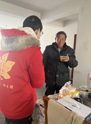 轄區(qū)獨(dú)居老人趙章華,無兒無女,最近新冠剛恢復(fù),還時(shí)不時(shí)的咳嗽,身體沒好利索,平時(shí)也沒什么精神。當(dāng)老人接過熱氣騰騰的雞湯之后,忍不住的抓著網(wǎng)格員的手說“一直以來家里就我一人,平時(shí)吃飯都是湊合。”吃著熱乎乎的飯菜,趙章華抹了一下嘴說,上年紀(jì)之后,他都不愿意在做飯上耗費(fèi)太多時(shí)間,炒菜時(shí)經(jīng)常一次性多炒一些,吃不了放在冰箱里,吃的時(shí)候放在微波爐里熱一下。“我沒有子女,你們就像我自己的孩子回家看望我一樣,前段時(shí)間聽說我發(fā)燒立即送來了退燒藥,現(xiàn)在又為我送來了熱乎乎的雞湯,現(xiàn)在每天都有人來看我,家里都熱鬧了。”