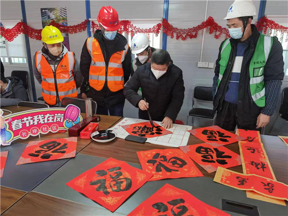 一大早,社區(qū)干部和工友們一起張燈結(jié)彩,經(jīng)過一陣忙碌,整個項目部被裝飾得“紅紅火火”,一下子滿滿的年味兒。