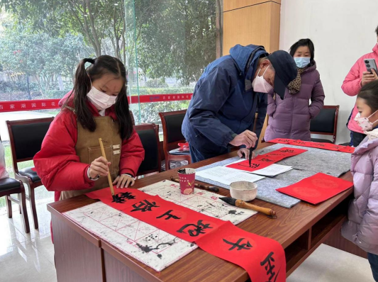 1月16日下午南京市江寧區(qū)秣陵街道湖濱社區(qū)新時(shí)代文明實(shí)踐站在百家湖國(guó)際花園活動(dòng)室開展了“我們的節(jié)日”系列活動(dòng)“文明江寧 溫暖新春”暨“志愿有’寧’”-寫春聯(lián)送?;顒?dòng),邀請(qǐng)了書法協(xié)會(huì)山崗老師現(xiàn)場(chǎng)寫春聯(lián)和福字給居民,讓孩子們?cè)诶_紛的冬日里體會(huì)新春的喜悅。