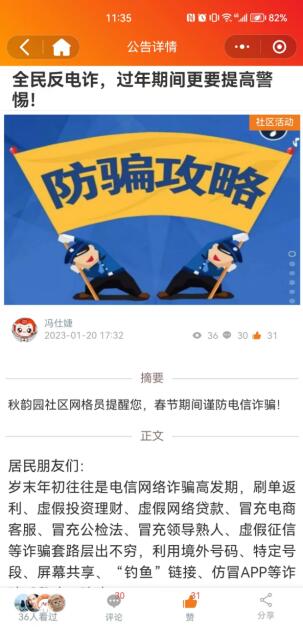 為了提高居民的反電詐意識,預(yù)防和減少電信詐騙案件的發(fā)生,過好平安祥和年,南京市棲霞區(qū)邁皋橋街道秋韻園社區(qū)充分發(fā)揮“掌上社區(qū)”的高覆蓋和時效性,通過掌上云平臺“社區(qū)公告欄”模塊發(fā)布“全民反電詐,過年期間更要提高警惕”,加強防范詐騙宣傳教育,構(gòu)建和諧的家庭環(huán)境和社區(qū)環(huán)境。