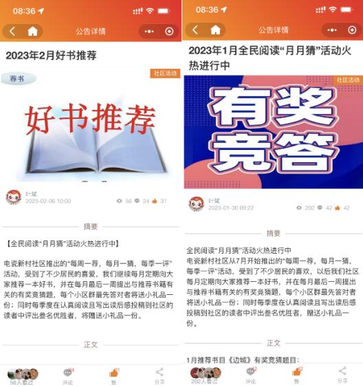活動(dòng)每月定期向大家推薦一本好書(shū),包含黨史教育、詩(shī)歌、散文、名人名著等書(shū)籍,組織大家線上交流書(shū)中的內(nèi)容和自己的心得體會(huì),分享讀書(shū)感悟,并在每月最后一周提出與推薦書(shū)籍有關(guān)的有獎(jiǎng)競(jìng)猜題,每個(gè)小區(qū)群最先答對(duì)者將送出小禮品一份;同時(shí)每季度在認(rèn)真閱讀且寫(xiě)出讀后感投稿到社區(qū)的讀者中評(píng)出三名優(yōu)勝者,贈(zèng)送獎(jiǎng)品,活動(dòng)內(nèi)容豐富多彩,福利多多,受到了不少居民的喜愛(ài)。