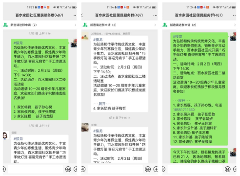 線上宣傳能使社區(qū)服務(wù)方便、快捷,也讓信息的覆蓋面更加廣泛。1月31日,社區(qū)通過“掌上云”平臺將元宵節(jié)制作花燈活動的通知發(fā)布到居民群、網(wǎng)格群內(nèi),邀請居民在群內(nèi)積極接龍報名參加活動,截至2月2日,共有21組家庭報名。