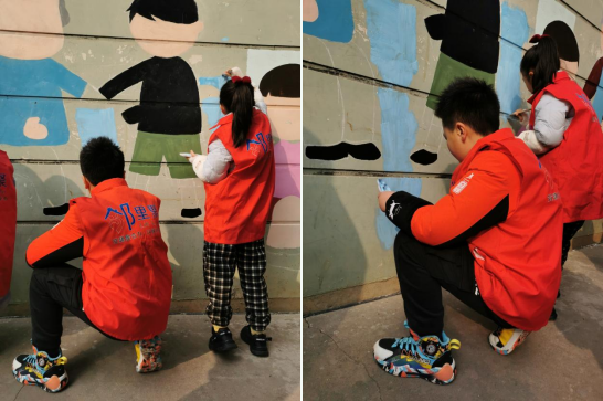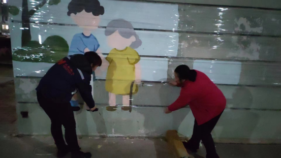 活動開始之前,志愿者通過在網(wǎng)格群內(nèi)發(fā)布活動通知,招募活動的參與人員,動員轄區(qū)內(nèi)的家庭積極參與。2月18日下午,老師們將墻壁當(dāng)成畫布,一筆一劃認(rèn)真地將墻壁布局,進(jìn)行圖案的勾畫,提前將輪廓畫好。碰到晚上下雨,公益樓長還自發(fā)前往活動場地將畫保護(hù)起來。