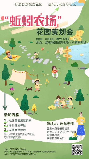 為創(chuàng)建和諧美麗社區(qū),營造優(yōu)美生活環(huán)境,提高社區(qū)居民生活的幸福感、滿足感,3月4日下午,南京市江寧區(qū)東山街道中前社區(qū)于武夷花園蚯蚓農場開展“打造自然生態(tài)花園 建設兒童友好社區(qū)”花園策劃會。