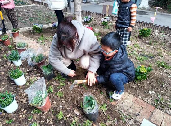 活動中,兒童們相繼領取了不同種類的花苗,利用小鋤頭、鐵鍬等工具開始種植,在老師和家長的幫助下進行松土、放苗、鋪土、澆水等一系列流程。最終,在大家的共同努力下,花園呈現(xiàn)出一副生機勃勃的美景,大家對花園煥然一新的面貌紛紛表示欣慰與自豪。