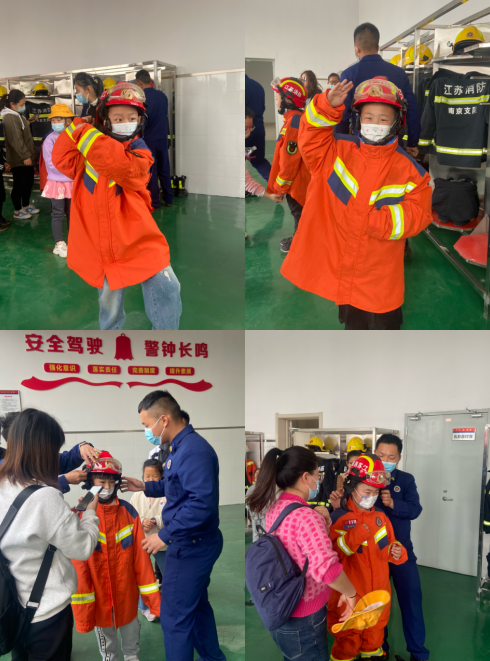 隨后,在消防員的專業(yè)講解下,大家對消防滅火常用的器材裝備進(jìn)行了全方位的學(xué)習(xí),如滅火器、消防員的衣服、靴子、頭盔等,還對如何接消防栓,水帶等進(jìn)行了學(xué)習(xí)。在身著消防員衣服、裝備來切身體驗(yàn)后,大家對消防員頂著沉重裝備還要進(jìn)行救人滅火作業(yè)的專業(yè)能力感到敬佩,紛紛贊揚(yáng)消防員叔叔們的頑強(qiáng)意志和專業(yè)技能。