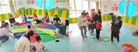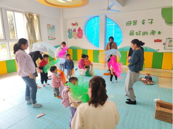 在常老師精心安排和指導(dǎo)下,孩子們和家長們玩起了操作性、手指活動等各種游戲,準(zhǔn)備了球、絲巾、彩虹、彩虹傘等,讓孩子們聽著音樂手腳動起來,跟著一起動起來。活動以互動為核心,提高孩子手眼協(xié)調(diào)能力,以建立和諧、融洽的親子情感為目標(biāo),讓家長融入課堂,把親子教育延伸到家庭教育中,共同促進(jìn)孩子們們的健康成長。