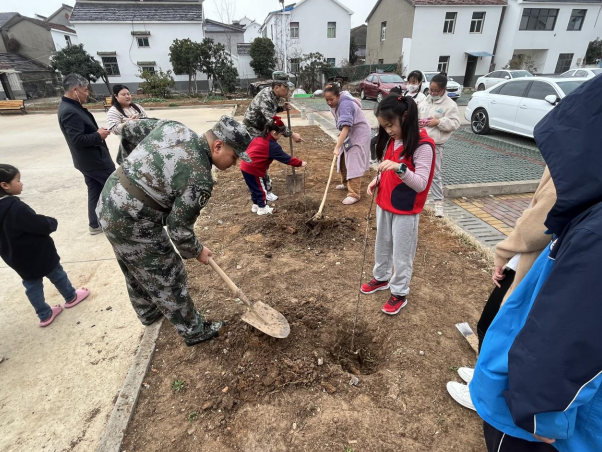 社區(qū)退役軍人先鋒隊(duì)志愿者首先向孩子們介紹“植樹節(jié)”的來歷、植樹造林的意義以及如何愛護(hù)小樹苗的知識(shí),將“愛綠護(hù)綠”的種子灑在每個(gè)孩子的心中。隨后,所有人三五一組,以“一埋二踩三提苗”的流程,揮鍬鏟土、培土育新,分工協(xié)作、默契配合。青少年們與家長一起共同“種小苗,成大樹”,用行動(dòng)爭做小小護(hù)綠使者。
