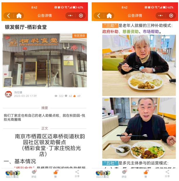 社區(qū)前期在掌上云社區(qū)發(fā)布公告,對(duì)銀發(fā)助餐點(diǎn)“棲彩食堂”進(jìn)行了大力宣傳。“棲彩食堂”是棲霞區(qū)創(chuàng)新的特色助餐服務(wù)品牌,是“棲彩頤養(yǎng)”養(yǎng)老服務(wù)品牌重要組成部分,也是南京市示范性助餐點(diǎn)之一。助餐點(diǎn)面積300平方米,由棲霞區(qū)好來(lái)屋公益服務(wù)中心負(fù)責(zé)運(yùn)營(yíng),站點(diǎn)功能齊全、環(huán)境溫馨,并配備適老化設(shè)施設(shè)備。目前,助餐點(diǎn)直接供應(yīng)中餐和晚餐,除堂食外,為9個(gè)居家站點(diǎn)提供送餐服務(wù),基本滿足了區(qū)域內(nèi)老年人助餐需求,同時(shí)輻射周邊社區(qū)居民和上班族。