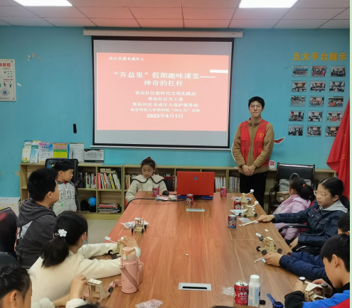 本期課堂內(nèi)容為:神奇的杠桿。課堂上,社區(qū)未成年人在南京師范大學(xué)物科院“向心力”志協(xié)大學(xué)生志愿者們的幫助下,與大學(xué)生講師志愿者一同學(xué)習(xí)了杠桿的原理。志愿者通過PPT教學(xué)展示,向大家講解了杠桿在生活科技中的廣泛運(yùn)用。社區(qū)未成年人踴躍發(fā)言,進(jìn)行生活聯(lián)想,有的說杠桿用于稱重,有的說在建筑工地上吊機(jī)所蘊(yùn)含的杠桿原理,有的講述了阿基米德關(guān)于杠桿的故事……隨后,社區(qū)未成年人們?cè)谥驹刚叩慕虒W(xué)下,開展了關(guān)于杠桿應(yīng)用的物理小實(shí)驗(yàn),手工組裝含有杠桿原理的實(shí)驗(yàn)器材,成功用最少的受力,翹起了重物。