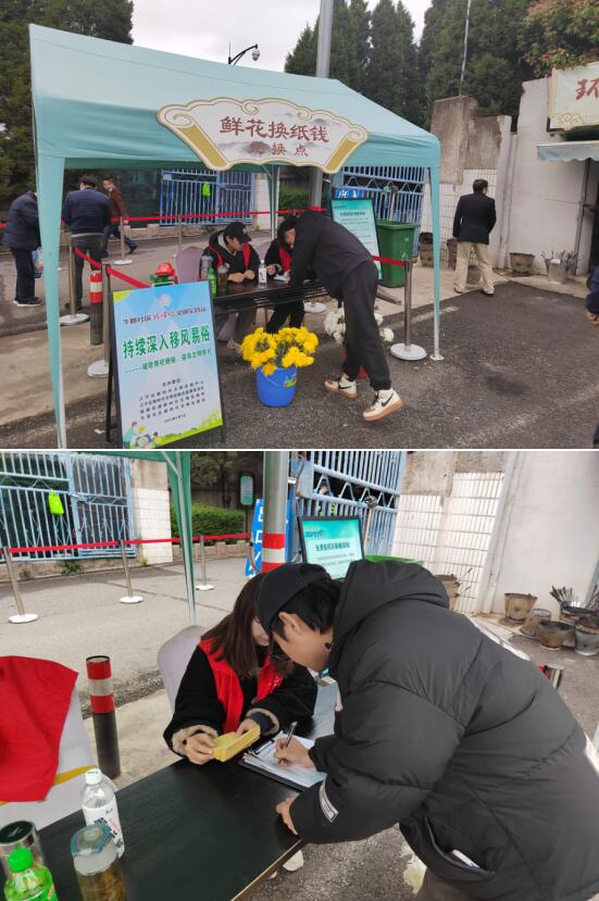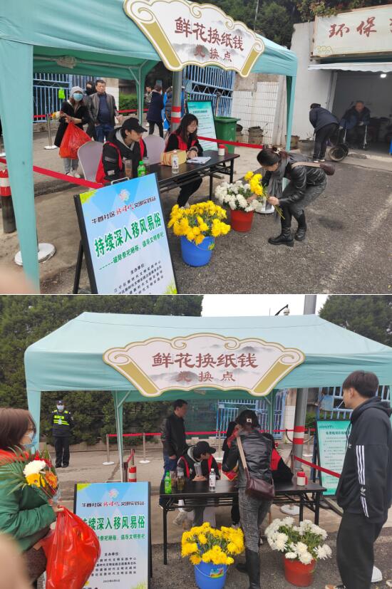 活動(dòng)現(xiàn)場(chǎng),社區(qū)工作人員在隱龍山墓園入口擺放展臺(tái)、張貼文明祭掃宣傳橫幅,設(shè)立“鮮花換紙錢”免費(fèi)兌換點(diǎn),積極宣傳綠色環(huán)保祭祀理念,提倡網(wǎng)上祭奠、親戚代掃、鮮花祭掃等文明祭祀活動(dòng),引導(dǎo)攜帶紙錢祭祀的市民根據(jù)實(shí)際需求,用紙錢免費(fèi)換取鮮花。號(hào)召大家做移風(fēng)易俗的先行者、文明祭祀的帶頭人,積極影響和帶動(dòng)身邊的廣大群眾,對(duì)不文明祭祀行為自覺抵制、積極勸導(dǎo),以實(shí)際行動(dòng)推動(dòng)移風(fēng)易俗,攜手共度一個(gè)安全、文明、節(jié)儉、綠色的清明節(jié)。