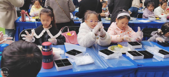 包好后,大家用保鮮膜將青團(tuán)包起來,放進(jìn)了盒子里,最后用準(zhǔn)備好的貼紙將盒子封起來,青團(tuán)就算制作完成啦。完成后,大家拿著自己的成果開心的和小伙伴們一起合影留念。