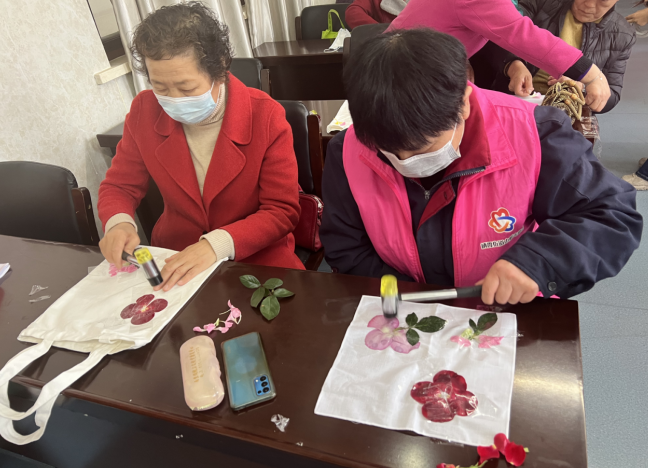 活動(dòng)中,老師詳細(xì)介紹了花瓣拓印工藝的基本知識(shí)、扎染特點(diǎn)及制作技巧。在操作環(huán)節(jié),工作人員為大家準(zhǔn)備了鮮花、棉麻環(huán)保袋、手帕以及小錘子,大家拿著花瓣自由創(chuàng)作?;ò晖赜∈浅錆M文藝色彩的印染方式,只有崇尚自然,領(lǐng)悟生活真諦的人,才能細(xì)心耐心的用拓印的方式,記錄下花瓣細(xì)致的脈絡(luò)。在經(jīng)過大家或輕或重的敲打保留花瓣隱約的痕跡,在悅耳的碰撞聲中,搖身一變,成為一幅幅驚贊的拓印藝術(shù)作品。