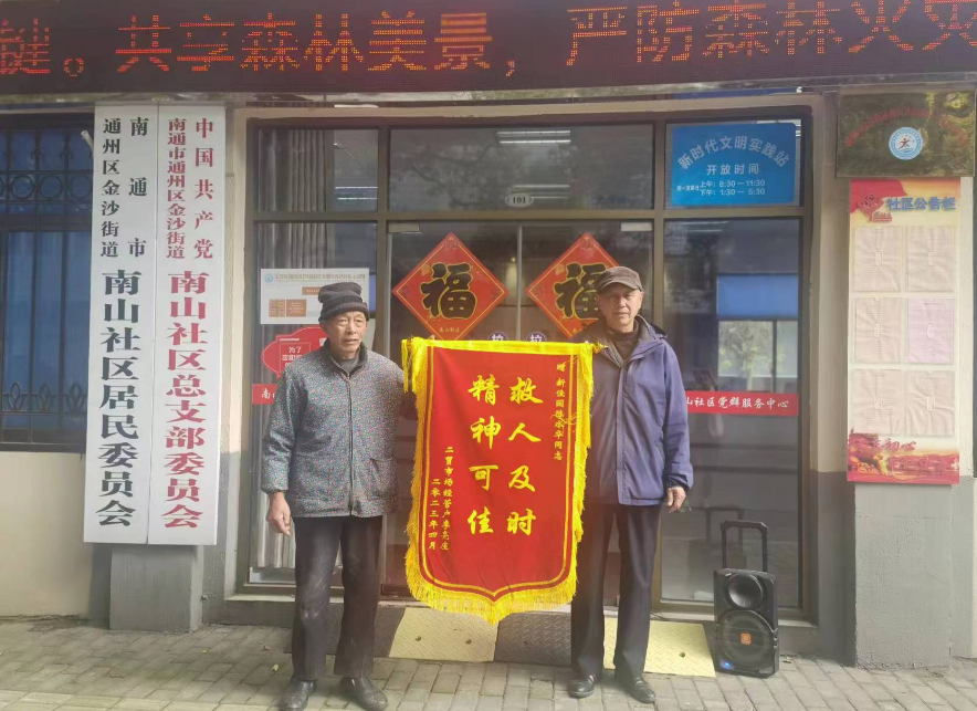 4月10日上午,李良莊老人來到南通市通州區(qū)金沙街道南山社區(qū)黨群服務中心,親手將一面寫著“救人及時,精神可嘉”的錦旗送至社區(qū),并眼含熱淚緊緊握著微網(wǎng)格員陳水華的手連連道謝。