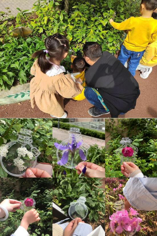 本次“定格春天”活動(dòng)分為三個(gè)階段:尋春——捕捉春天的氣息,留春——制作壓花杯墊和書(shū)簽,惜春——合影留念。小朋友與大自然親密接觸,在各個(gè)園區(qū)拍攝當(dāng)下的春景,月季、鳶尾、繡線菊、杜鵑、玫瑰等被小朋友欣喜的“裝”進(jìn)瓶子里。