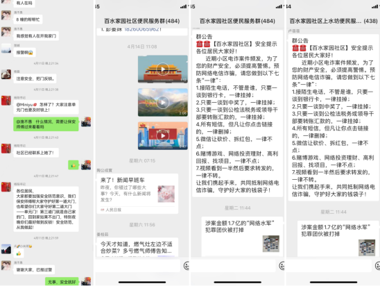 線上宣傳更廣泛 百水家園社區(qū)利用“掌上云社區(qū)”平臺(tái)發(fā)布國(guó)家安全教育日主題海報(bào)、闡釋有關(guān)國(guó)家安全的常識(shí),轉(zhuǎn)發(fā)相關(guān)圖解、防范電信網(wǎng)絡(luò)詐騙海報(bào)20余次,普及群眾2000余人。當(dāng)人身安全受到傷害時(shí),居民也第一時(shí)間在掌云群內(nèi)尋求幫助,工作人員及時(shí)詢(xún)問(wèn)、迅速處理。同時(shí),社區(qū)通過(guò)“掌上云”平臺(tái)呼吁大家一定要加強(qiáng)安全防范,保護(hù)好自身安全。