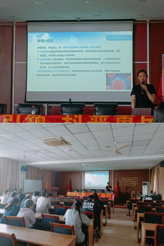 本次宣講特邀請江蘇省腫瘤醫(yī)院放療科護(hù)士長鄒美英及副主任醫(yī)師劉雅恬給居民開展知識講座,講座圍繞腫瘤流行病學(xué)概況、癌癥的一級預(yù)防、癌癥的二級預(yù)防等內(nèi)容,深入淺出地向居民們講解了癌癥的種類、發(fā)病的相關(guān)因素、表現(xiàn)、如何預(yù)防等,倡導(dǎo)居民養(yǎng)成良好的飲食習(xí)慣,通過健康的生活方式防癌抗癌,做到早預(yù)防、早發(fā)現(xiàn)、早診斷、早治療。