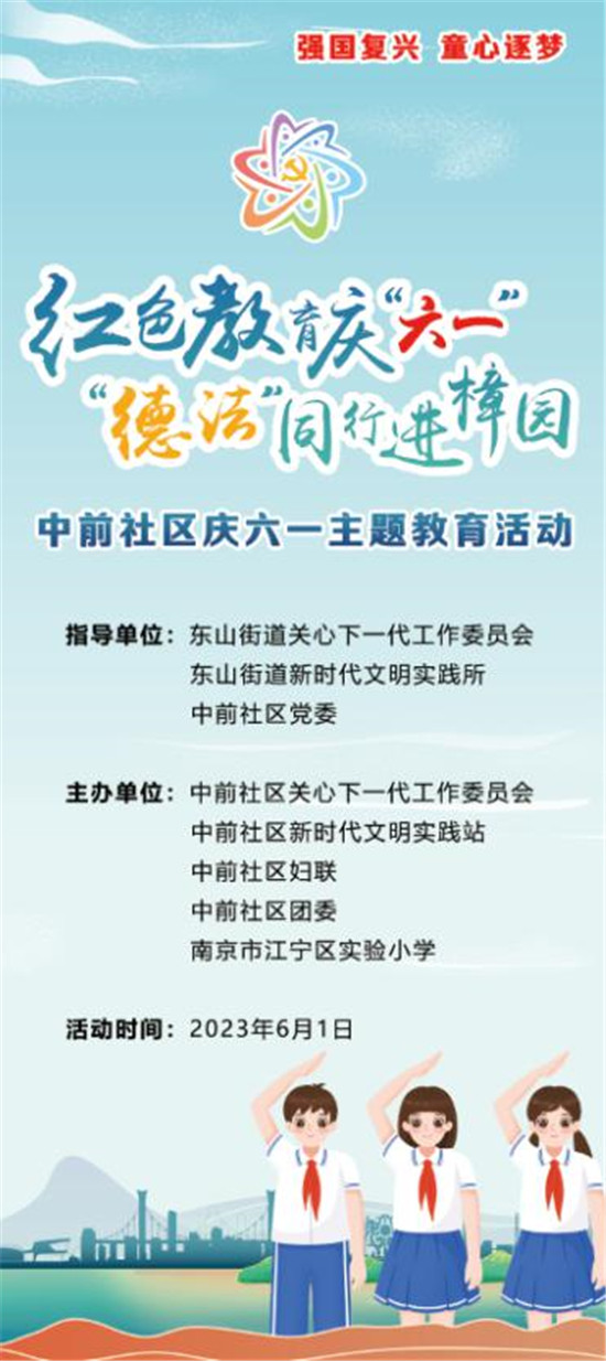 為貫徹落實(shí)黨的二十大精神,弘揚(yáng)以偉大建黨精神為源頭的中國(guó)共產(chǎn)黨人精神譜系,深入開(kāi)展社會(huì)主義核心價(jià)值觀宣傳教育,深化愛(ài)國(guó)主義、集體主義、社會(huì)主義教育、著力培養(yǎng)擔(dān)當(dāng)民族復(fù)興大任的時(shí)代新人。“六一”兒童節(jié)當(dāng)天,在南京市江寧區(qū)東山街道關(guān)工委、東山街道新時(shí)代文明實(shí)踐所的指導(dǎo)下,東山街道中前社區(qū)關(guān)工委、中前社區(qū)新時(shí)代文明實(shí)踐站聯(lián)合大黨委成員單位江寧實(shí)驗(yàn)小學(xué),開(kāi)展了“紅色教育慶‘六一’ “德法”同行進(jìn)樟園”主題教育活動(dòng)。